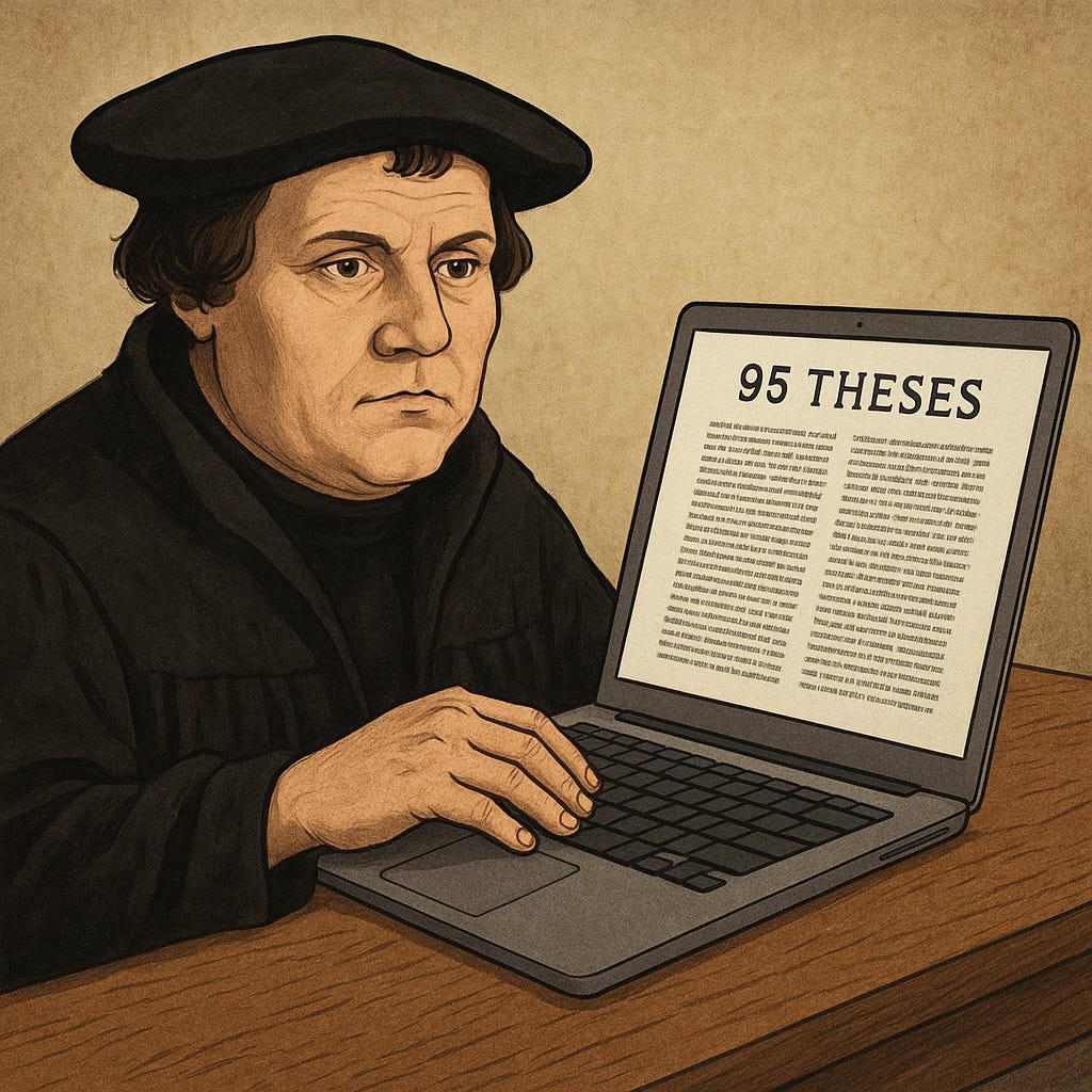 This Sunday, the congregations in the Lutheran expression of Christianity will commemorate the Protestant Reformation. On October 31, 1517, Martin Luther, an Augustinian priest and theology professor in Wittenberg, Germany, posted what became known as the 95 theses. They were a list of questions and statements focused on the practice of indulgences, the sale of eternal promises. Through a combination of technology, the Gutenberg printing press, cultural shifts, the emerging Renaissance, and a series of political/economic dislocations of the peasantry, these 95 theses ignited a reforming of the church and a revolution in European society.